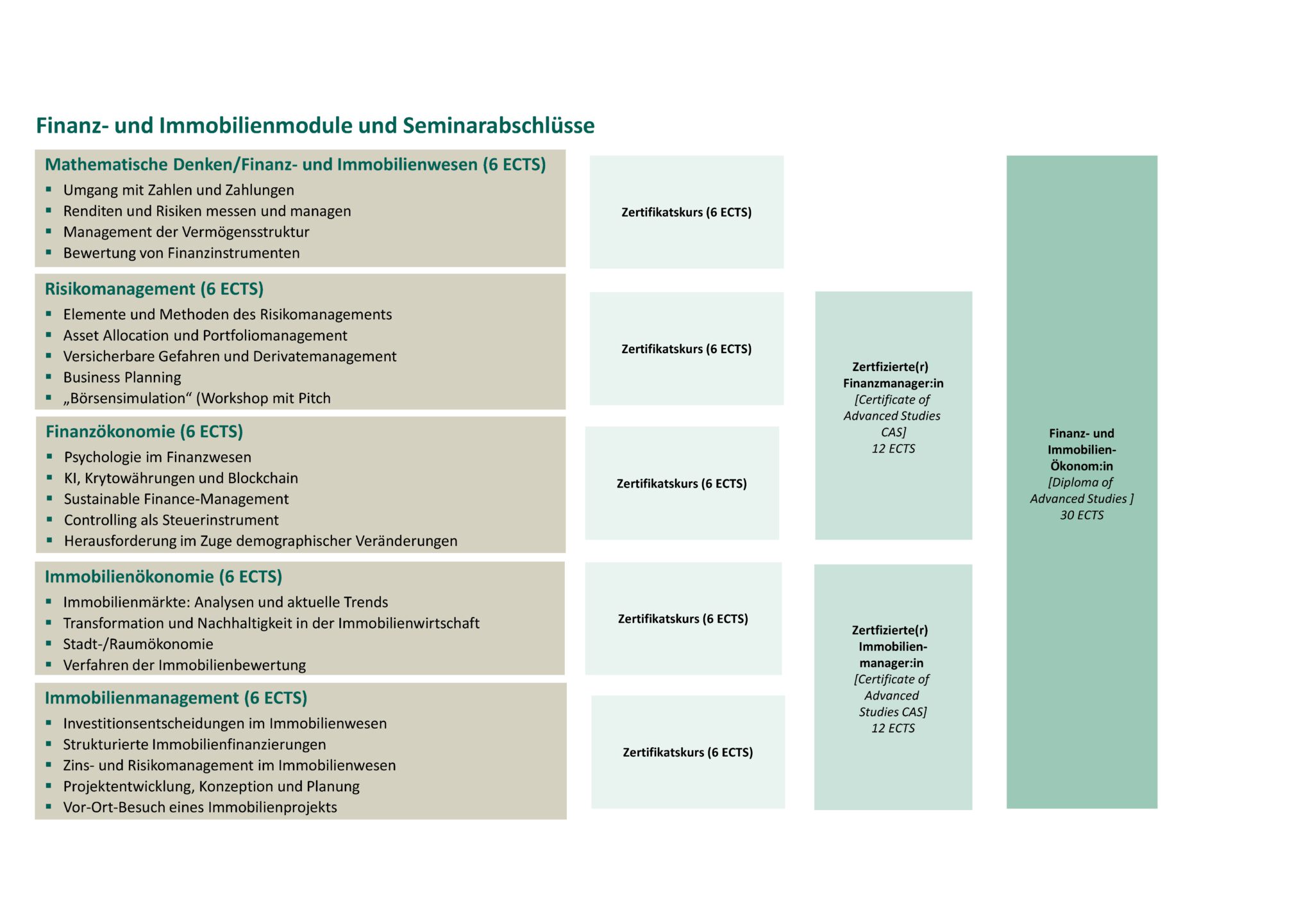 Die Module können sowohl einzeln belegt werden, lassen sich aber auch modular zu einzelnen Abschlüssen bündeln oder können als Einstieg in die akademischen MBA-Abschlüsse „Finanzen und Management“ bzw. „Immobilien und Management“ dienen.